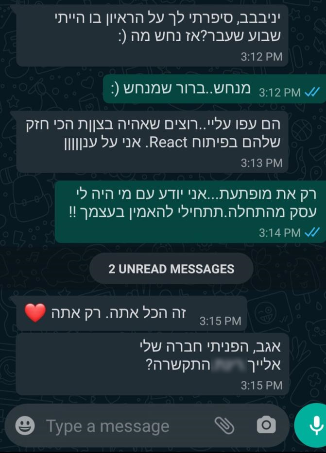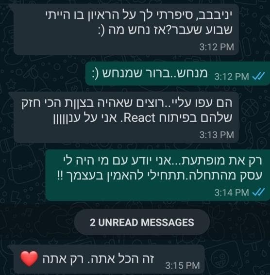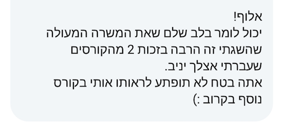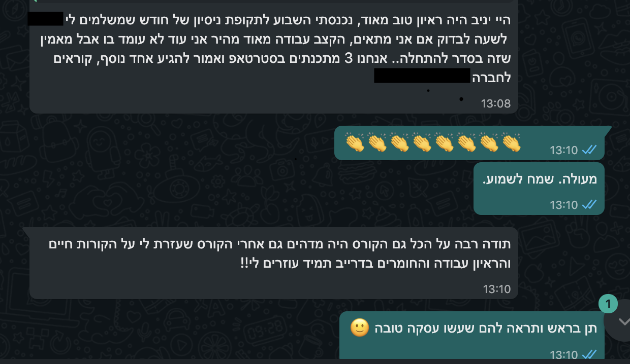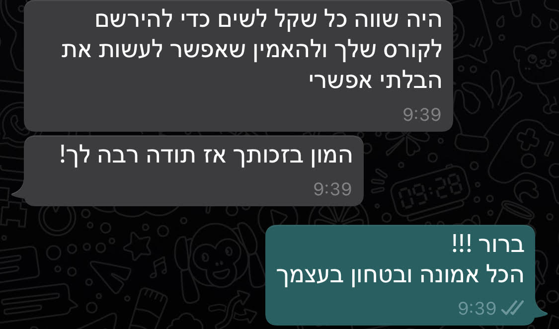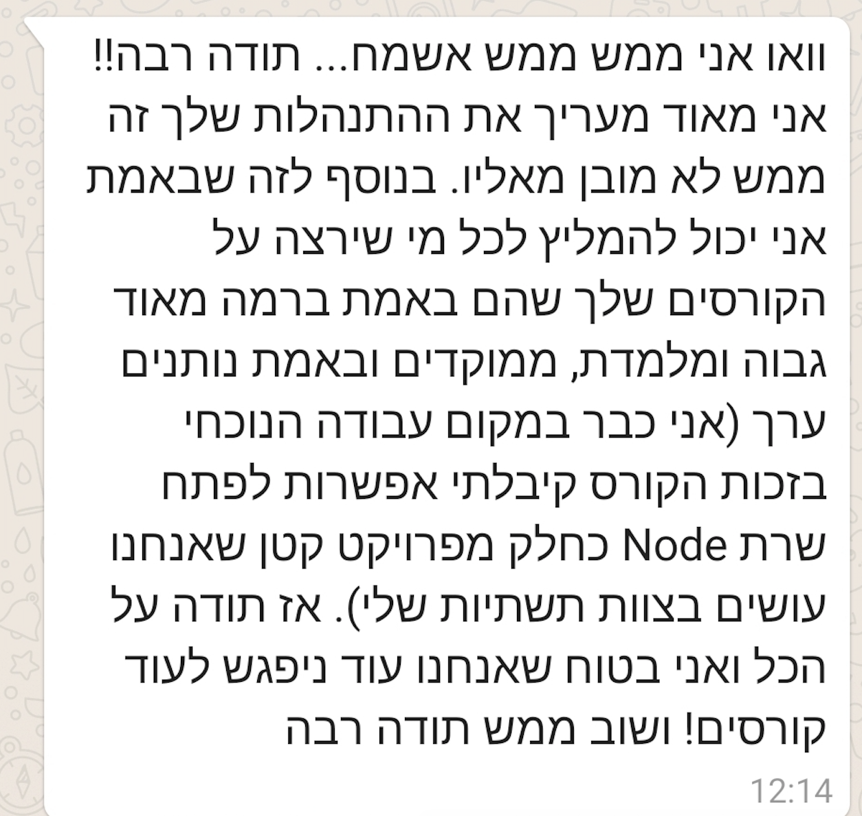 I will train you in some of the most popular, sought-after courses in the software development industry, to reach the highest possible level. I do not use slides and presentations; instead, you will go through a veritable ”bootcamp” in which you will gain real experience, based on the Extreme70 model – the most practical method in Israel. But that’s just the beginning… I will also accompany you as your own personal mentor, 24/7. I will prepare you for the industry, but I will also continue to support you for years to come. Any question, advice, guidance – at any stage of your career – I’ll be there. I will never stop upgrading your professional skills with the best webinars in the field of development (to sign up for webinar invitations, click “here” for a link to the webinar registration page).